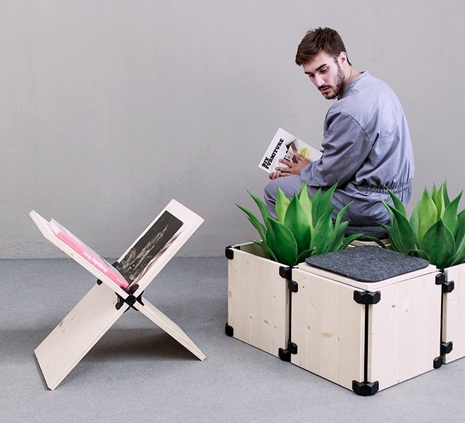 „PlayWood“ yra novatoriška modulinė baldų sistema, apimanti jungtis ir lentas, kad būtų sukurti stalai, lentynos, kėdės ir dar daugiau.